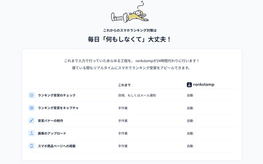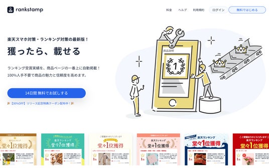 楽天ランキング “獲ったら、載せる” 商品ページ(スマホ/PC)にリアルタイムで自動掲載!楽天市場ランキングの活用に特化した完全自動のスマホ対策支援ツール「rankstamp」が正式リリース。
