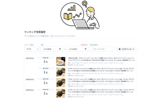 rankstampでは、受賞日や、商品管理番号を使って、過去の受賞履歴を検索することができます。それらのデータはCSV形式でダウンロードも可能。ランキング入賞状況データを有効的にご活用いただけます。