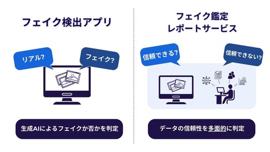 本サービスには、該当のデータがAIで生成されたフェイクデータか否かを判定するフェイク検出アプリの提供と、該当のデータが過去画像の流用や編集が加えられたデータか否かといったデータの信頼性を多面的かつ総合的に検証するフェイク鑑定・レポートサービスがあります。