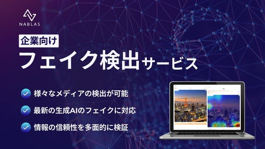 AI総合研究所として活動するNABLAS株式会社 (本社 : 東京都文京区本郷、 代表取締役 所長 : 中山 浩太郎、 以下「当社」)は、企業向けフェイク検出サービスをリリースいたしました。これにより、メディアやSNSにおける情報だけでなく人間の目では見抜けないレベルのフェイクコンテンツに対しても、ユーザー独自で専門的かつ信頼性の高いフェイク判定を行えるようになります。