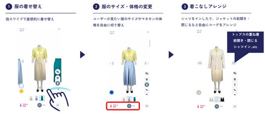 ECサイトを訪れたユーザーは自分に近い体型を画面上で選択することで「自分が実際に着用した場合に近い着用感を確認」しながら「オンライン上で自由に服を組み合わせ、コーディネート」を楽しむことができます。