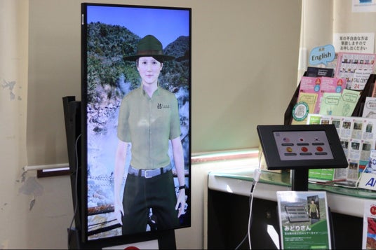観光案内所を訪れる国内外の観光客の方々がタブレットを操作してみどりさんに話しかけると、目の前の大型サイネージに映し出された等身大のみどりさんが質問に回答します。さらにみどりさんは来場者にすぐ隣にあるパンフレットやスタッフへの誘導も行います。
