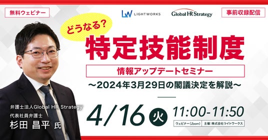 外国人雇用に特化したeラーニングサービス「まなびJAPAN」などを提供する株式会社ライトワークス(本社:東京都千代田区、代表取締役:江口夏郎、以下「ライトワークス」)は、2024年4月16日(火)に、「特定技能」の在留資格に係る制度について弁護士・杉田 昌平氏が解説する無料ウェビナーを開催いたします。