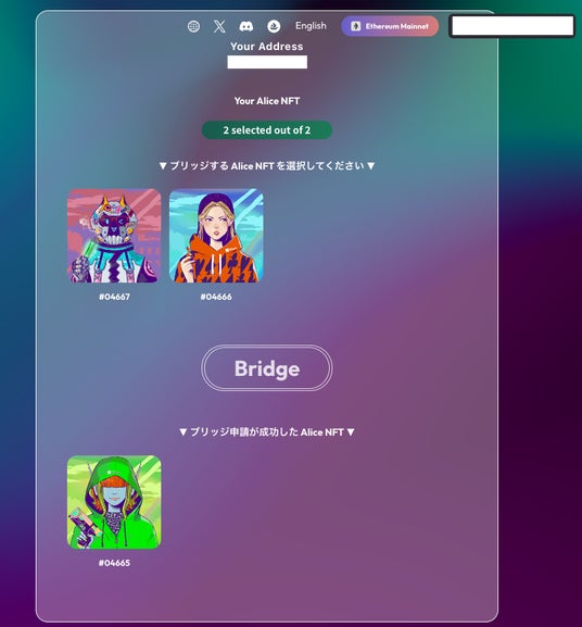 Alice NFTのホルダーは「Alice Mantle Bridge Station」上で、保有しているAlice NFTを選択し、ブリッジ申請を行います。