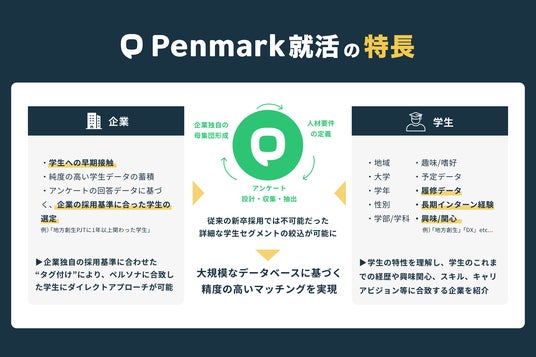 株式会社ペンマーク(本社:東京都目黒区、代表取締役:横山直明、以下ペンマーク)は、新卒採用市場における学生と企業の情報格差やマッチングの非効率性といった課題解決のため、当社の強みである“圧倒的な学生ユーザー数”と“学生の履修・アンケートデータ”を活用した、新卒採用支援サービス「Penmark就活 for Business」の提供開始をお知らせいたします。また、本サービスのローンチを記念して、先着10社限定のトライアルキャンペーンを実施いたします。