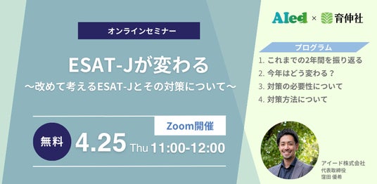 アイード株式会社(本社:東京都新宿区、代表取締役:窪田優希、以下「アイード」)は、「ESAT-Jが変わる ~改めて考えるESAT-Jとその対策について~」というテーマのウェビナーを開催します。