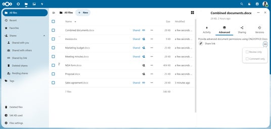 ONLYOFFICE Docsのバージョン7.4で導入された高度なアクセス権限に基づいて、このアップデートでは、Nextcloud Talkアプリで作成されたファイルと公開アクセスのあるファイルにも高度な権限が拡張されます。これには、レビュー、コメント、カスタムフィルタリング権限が含まれ、ユーザーはドキュメント共同作業をより細かく制御できるようになります。