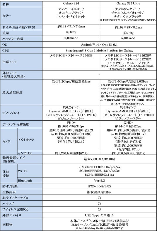 <主な仕様:「Galaxy S24」、「Galaxy S24 Ultra」>