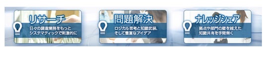 イノベーションを生み出すためには、既存の知識やアイデアの組み合わせが効果的といわれ、さらに未知の分野の技術やアイデアを取り入れることも求められます。知識武装に伴う新たな気付きを「リサーチ」、問題をロジカルに構造化し解決策を支援する「問題解決」、社内に埋没した過去の技術資産や思考プロセスの再利用を促進する「ナレッジシェア」の3つの切り口で、イノベーション創出を支援します。