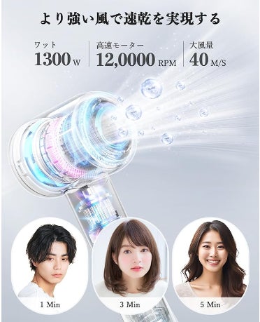 高速ヘアドライヤーは先進的な空気力学設計を採用し、風速40メートル/秒の強力な風を利用して、髪の乾燥時間を迅速に短縮します。