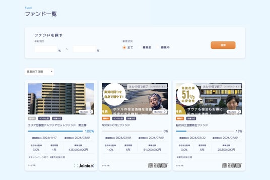 ファインディングファンドでは、年利回りや販売状況から、あらゆるファンドを一覧検索することができます。