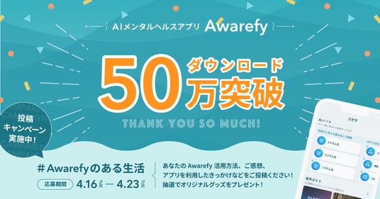 「心の健康と成長を支えるデジタル・メンタル・プラットフォームを実現する」をミッションに、AI メンタルヘルスアプリ「Awarefy(アウェアファイ)」の企画・開発・運営を行う株式会社Awarefy(本社:東京都新宿区、代表取締役 CEO 小川 晋一郎)は、2024年4月にAIメンタルヘルスアプリ「Awarefy」において、2020年5月からのアプリリリース以降、累計50万ダウンロードを突破したことをお知らせします。