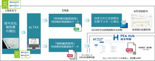 また、『PCA給与シリーズ』『PCA Hubシリーズ』は、令和6年6月から実施される「定額減税」や令和6年4月から運用開始された「特別徴収税額通知の電子化」への制度にも対応いたします。