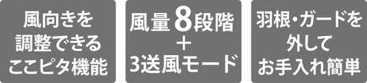 また、風量は8段階で切り替えができるため、季節やお部屋の間取りにあわせて最適な送風を設定することができます。さらに、衣類乾燥モード・おやすみモード・リズムモードがあり、シーンに合わせた使用が可能です。羽根や前側のガードだけでなく、埃のつきやすい後ろ側のガードなどもドライバーを使わずに全て取り外せるため、お手入れも簡単です。