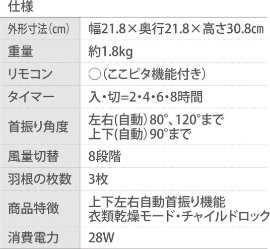 「ANGVA-FA15-DC-W」は、サーキュレーターとして初めて、好きな角度で風向きをピタッと調整※できる「ここピタ」機能を搭載しています。リモコンを使用して首の向きを細かく調節できるため、ピンポイントで送風したいときや衣類乾燥などでも役立つ機能です。