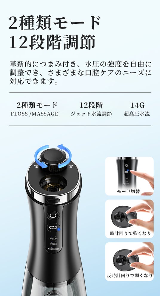 ハンドルのノブで12段階調節、 水圧の強度を自由に調整でき、規定の何段階かの水圧では強すぎる・弱すぎるという不満を解消できて、快適な水圧を見つけ、さまざまな口腔ケアのニーズに対応でき、初心者でも安心に使えます。
