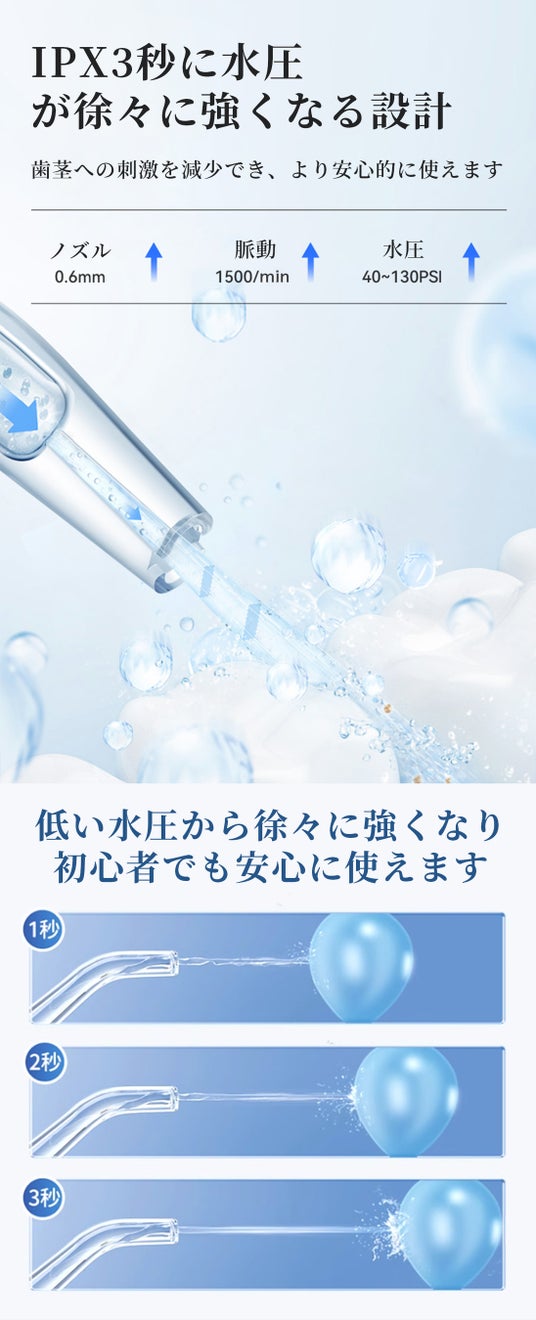 電源入れてからの3秒間水圧が徐々に強くなる設計ため、歯茎への刺激を減少でき、より安心して使用できます。