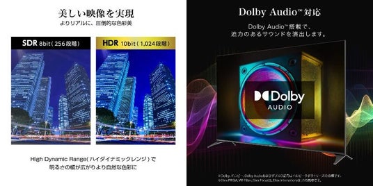 本製品は、HDR10を採用しており、明るさの幅が広がり、より自然な色彩で映像が表現されます。また、立体音響技術「Dolby Atmos」によって、まるでその場にいるかのような臨場感あふれるリアリティの高い映画やドラマ、音楽などのサウンドを演出します。なお、本製品はBluetooth 5.0に対応しており、ヘッドホンやサウンドバーを接続することで、迫力のあるサウンドを没入感たっぷりにお楽しみいただけます。