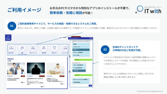 PSソリューションズ株式会社(本社:東京都港区、代表取締役社長:村松佑樹)は、中小企業向けITサポートサービス「IT with」を2024年2月15日から提供開始し、約2カ月で、導入社数が250社を突破したことをお知らせいたします。