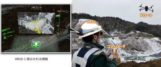 操縦者が装着しているXR10による空間ヘッドアップディスプレイ(HUD)には重畳映像とドローンの内部情報や、飛行している機体の位置を地図上で表示するため、操縦者はドローンを操縦しながら機体の状態、飛行位置、3Dモデルの重畳など複数の情報を同時に確認する事が可能です。