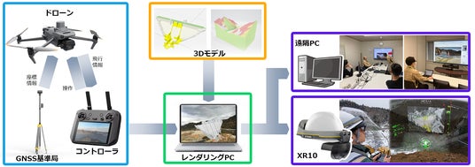 ARレンダリングの処理負荷がドローン制御やXRデバイスに影響するのを回避するために、これらの演算を現場ネットワーク内の高性能PCで処理。PCから現場のネットワーク上で映像を共有する事で、各デバイスの負担を軽減しながら、高解像度なリアルタイムレンダリングと通信速度を実現。遠隔会議システムと連携する事で、インターネットを通じて遠隔地とも空撮映像の共有を可能にしました。