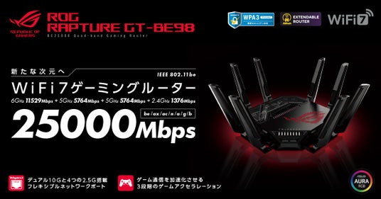 ASUS JAPAN株式会社は、ゲーミングブランドのRepublic of Gamers(ROG)より、新規格のWiFi7に対応し、ゲーム通信を加速し低遅延を実現し、安心と充実したネットワーク供給を可能とするゲーミングルーター「ROG Rapture GT-BE98」を発表しました。
