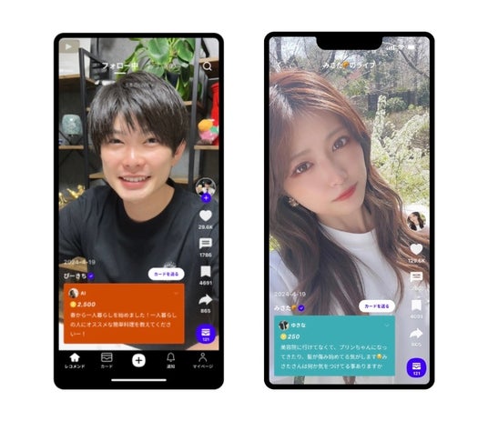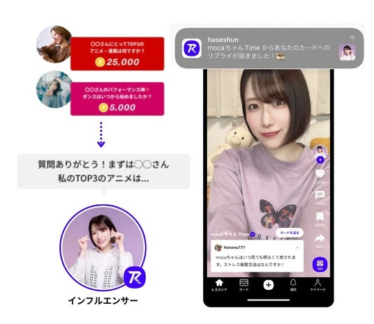 ライバー(配信者)は、「カード」形式で質問やリクエストを募集することができるため、事前に配信内容を企画する必要がなく、より気軽に配信を実現します。質問やリクエストに答える「カード」の回答を通じて、カード単位で収益化することができます。