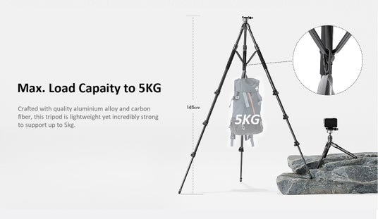 付属のデスクトップ三脚とクイックリリースメカニズムを使用し、フルサイズのトラベル三脚として活用することもできます。重さ1.16kg、最大145cmまで伸長し、最大3kgの機材を支えられ、複数の角度(20度、50度、80度)に調整できるため、さまざまな地形で安定性を確保できます。