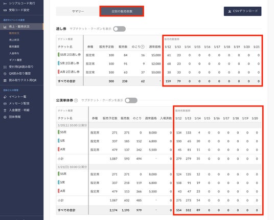 当日券の販売に対応しました。前売り券・当日券、それぞれの金額を設定が可能です。開催当日、指定した時間になると自動で当日券の金額に切り替わります。teket内で開催されたイベントを基にした調査の結果、開催当日と前日の販売数は全体の2割にのぼります。当日券がWebサイト経由で購入できることで、さらなる売上向上が見込めます。活用例