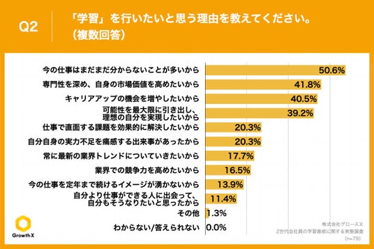 Q1で「積極的に行いたい」「どちらかというと行いたい」と回答した方に、「Q2.「学習」を行いたいと思う理由を教えてください。(複数回答)」(n=79)と質問したところ、「今の仕事はまだまだ分からないことが多いから」が50.6%、「専門性を深め、自身の市場価値を高めたいから」が41.8%、「キャリアアップの機会を増やしたいから」が40.5%という回答となりました。