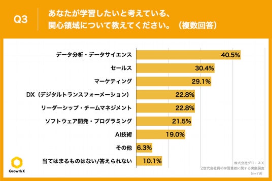 Q1で「積極的に行いたい」「どちらかというと行いたい」と回答した方に、「Q3.あなたが学習したいと考えている、関心領域について教えてください。(複数回答)」(n=79)と質問したところ、「データ分析・データサイエンス」が40.5%、「セールス」が30.4%、「マーケティング」が29.1%という回答となりました。