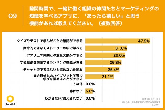 Q8で「非常にそう思う」「ややそう思う」と回答した方に、「Q9.隙間時間で、一緒に働く組織の仲間たちとマーケティングの知識を学べるアプリに、「あったら嬉しい」と思う機能があれば教えてください。(複数回答)」(n=71)と質問したところ、「クイズやテストで学んだことの確認ができる」が47.9%、「断片的ではなくストーリーの中で学べる」が31.0%、「アプリ上で仲間との意見交換ができる」が29.6%という回答となりました。