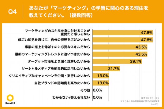 Q3で「マーケティング」と回答した方に、「Q4.あなたが「マーケティング」の学習に関心のある理由を教えてください。(複数回答)」(n=23)と質問したところ、「マーケティングのスキルを身に付けることが重要だと感じるから」が47.8%、「幅広い知見を通じて、自分の視野を広げたいから」が47.8%という回答となりました。