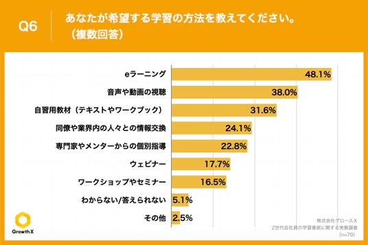 Q1で「積極的に行いたい」「どちらかというと行いたい」と回答した方に、「Q6.あなたが希望する学習の方法を教えてください。(複数回答)」(n=79)と質問したところ、「eラーニング」が48.1%、「音声や動画の視聴」が38.0%、「自習用教材(テキストやワークブック)」が31.6%という回答となりました。