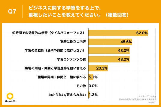 Q1で「積極的に行いたい」「どちらかというと行いたい」と回答した方に、「Q7.ビジネスに関する学習をする上で、重視したいことを教えてください。(複数回答)」(n=79)と質問したところ、「短時間での効果的な学習(タイムパフォーマンス)」が62.0%、「実務に役立つ内容」が45.6%という回答となりました。