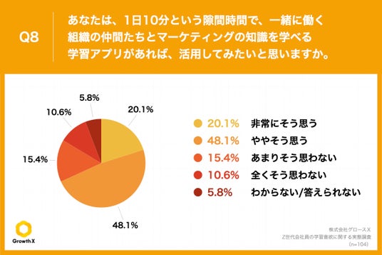 「Q8.あなたは、1日10分という隙間時間で、一緒に働く組織の仲間たちとマーケティングの知識を学べる学習アプリがあれば、活用してみたいと思いますか。」(n=104)と質問したところ、「非常にそう思う」が20.1%、「ややそう思う」が48.1%という回答となりました。