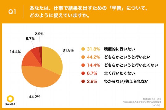 「Q1.あなたは、仕事で結果を出すための「学習」について、どのように捉えていますか。」(n=104)と質問したところ、「積極的に行いたい」が31.8%、「どちらかというと行いたい」が44.2%という回答となりました。
