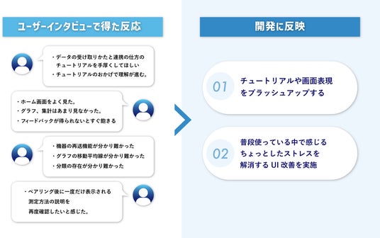 グラフ機能の「機器選択」、「期間選択」、「分類表示」、「移動平均線」で傾向の把握をわかりやすくサポート。直感的に"今"の健康状態を把握することができます。毎日ストレスなく使い続けられるように、ユーザーインタビューを繰り返し行い、そこで得たユーザーからの要望を開発内容に反映させながら、手軽さや簡単さ、わかりやすさ、そしてアプリの使い心地にこだわり開発されています。<開発内製化支援の体制>