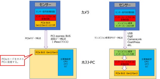 通常は右図のようにカメラ側とホストPC側それぞれに汎用的なインターフェースへプロトコル変換するための回路が必要となるが、Ximea社のPCI-Expressインターフェースの場合、PCIeバスへ直接アクセスしてデータ転送が可能となる。
