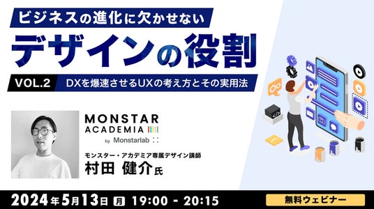 ※締切:2024年5月13日(月) 19:00ビジネスの進化によりますますその重要性を増すデザインの役割。DX(デジタルトランスフォーメーション)とUX(ユーザーエクスペリエンス)は、ビジネスのデジタル化と顧客体験の向上において密接に関連しています。本セミナーシリーズでは、DXとUXの関係性を理解し、両者を統合した効果的なデザイン戦略を構築するためのヒントや考え方をお伝えしています。第2回となる今回のテーマは「DXを爆速させるUXの考え方とその実用法」。DXに必要不可欠な要素であるUXに焦点を当て、その考え方について詳しくお話しします。顧客理解はビジネスにおいて重要であり、当然押さえておきたい要素ですが、UXの手法ではよりユーザーの解像度を上げ、仮説の精度を上げることができます。テクノロジーの進化によってあらゆるものを取り巻く環境が複雑さを増し、将来の予測が困難なVUCA*の時代だからこそ身につけておきたい思考法のひとつです。デザインがビジネスに果たす重要な役割を理解し、その力を最大限に活用することで、新たな可能性を開拓してみませんか?DXにおけるUXとは何か、また、それがどのようにビジネスに貢献するのかについて、ご興味をお持ちの方はぜひご参加ください。なお、本セミナー内では、今回ご登壇いただく村田健介氏が講師を務め、デザインをクリエイティブ力と思考力の双方から学べる「モンスター・アカデミア」のサービスもご紹介します。*VUCAとは…Volatility(変動性)、Uncertainty(不確実性)Complexity(複雑性)、Ambiguity(曖昧性)の頭文字をとった造語。<セミナーの内容>