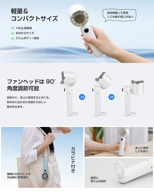 僅か180gの軽量設計でストレスフリーな持ち運びを実現。コンパクトなサイズながら、90度までの角度調節も可能で、常に最適な風をお届け。底部のカラビナが、バッグに掛ける瞬間の便利さを加速します。さらに、スタンドとしても活躍し、卓上ファンとしても一役買います。