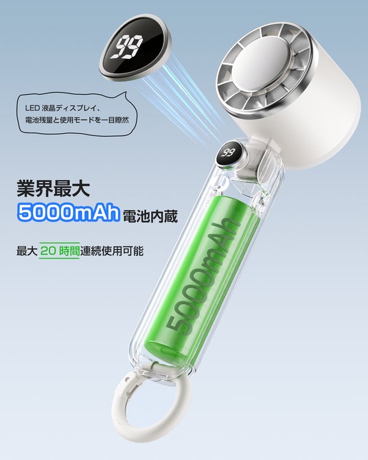 𝓟𝓸𝓲𝓷𝓽4 使い勝手が良い!5000mAhで携帯扇風機史上最長の使用時間を挑戦!一般的な手持ち扇風機は2000~3000mAhの電池を搭載し、最長で10時間しか連続使用できません。HAGOOGIの新たな携帯扇風機「OT-F17」は5000mAhの大容量電池を搭載し、弱風モードで最長20時間、中風モードで6~9時間、強風モードで3~6時間の連続使用が可能です。通勤や通学などの移動中だけでなく、一日中デスクワークや野外イベント中も余裕を持って使用できます。LEDディスプレイが搭載されており、バッテリー残量や風量段階が一目でわかり、従来のランプ式よりも細かく電池残量を把握でき、扇風機の充電タイミングもわかりやすくなります。