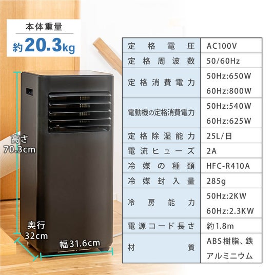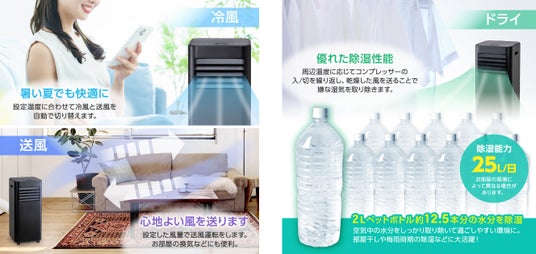本製品には、冷風・送風・ドライの3つの運転モードが搭載されており、設定温度に合わせて冷風と送風を自動で切り替える為、暑い夏でも快適にお過ごしいただけます。また、ドライは、1日当たり25L(2Lペットボトル約12.5本分に相当)の除湿能力を有しており、不快な湿気を取り除いて梅雨時でも過ごしやすく、部屋干しをしやすい環境を整えます。