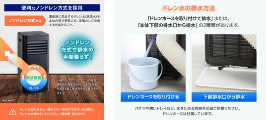 スポットエアコンの運転中にはドレン水(除湿水)が発生しますが、本製品ではノンドレン方式を採用しており、ドレン水を蒸発させて温風として排出することができます。そのため、ドレン水の排出頻度を減らし、排水の手間を軽減できます。また、本体内部には約600mlまでドレン水を貯めることができ、貯水量を超えた分はドレンホースまたは下部排水口を使用して排水することができます。