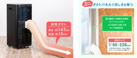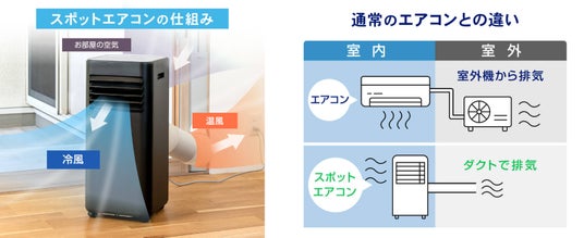スポットエアコンは、背面から取り込んだ空気を冷風と温風に分け、正面の吹き出し口からは冷風を、背後の排気口からは温風を排出します。通常のエアコンは室外機から温風を排出しますが、スポットエアコンは背後のダクトから温風を排出する点で異なります。そのため、付属のダクトやダクトパネルを使用し、温風を室外に排出することで、お部屋の冷却効率を向上させることができます。