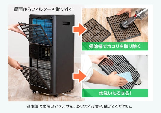 本体背面にあるフィルターは取り外し可能で、水洗い可能な為、かんたんにお手入れすることができます。