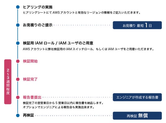 ・システム構築における監査をクリアしたい当社はこれらの課題を解決するため、AWS の製品とサービスのセキュリティ保護に関する専門資格「AWS Certified Security - Specialty」を保有した技術者が、「CIS Amazon Web Services Foundations Benchmark v2.0.0」への適合率をチェックし、各項目に関する詳細な説明と適合に向けた適切な手順を提示することで未然にインシデントを防ぐなど、セキュリティリスクの低減へ導きます。■AWSセキュリティチェックの流れ