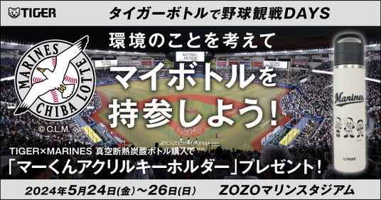 熱制御テクノロジーで世界をリードするタイガー魔法瓶株式会社(社長:菊池嘉聡、本社:大阪府門真市)は、千葉ロッテマリーンズとコラボレーションし、マイボトルを持参してスポーツ観戦を楽しむスタイルを推奨する「タイガーボトルで野球観戦DAYS~環境のことを考えてマイボトルを持参しよう~」を 5月24日(金)~26日(日)にZOZOマリンスタジアムで行われる3連戦にて、開催いたします。