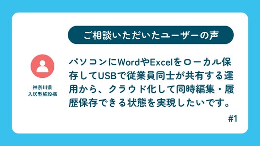 パソコンにWordやExcelをローカル保存してUSBメモリで従業員同士が共有する運用から、クラウド化して同時編集・履歴保存できる状態を実現したいです。