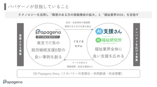 2023年9月に就労継続支援B型「パパゲーノ Work & Recovery」を日本一大きな精神科病院 都立松沢病院のある八幡山にて開所し、主に「精神障害」「発達障害」のある方がパソコンを使ってITスキルを学び、1人1人の希望や体調にあわせて働く施設を運営しています。また、生成AIを中心に多様なテクノロジーを活用し、障害のある方の挑戦機会の拡大と支援現場のDX推進を目指してきた知見を生かして、障害福祉施設向けのDX支援サービスを開発・提供してきました。2024年3月には、面談音声をスマホで録音するだけで支援記録を作成できる音声解析AI支援記録アプリ「AI支援さん」もリリースしています。